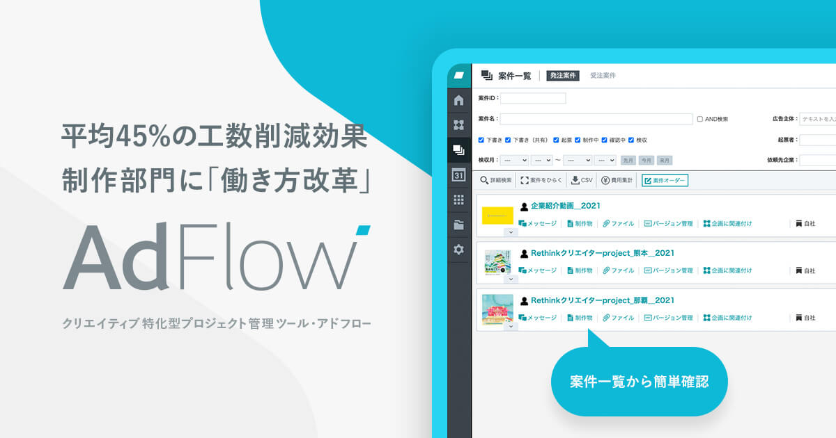 日本語対応AdFlowは、広告クリエイティブ制作に特化したプロジェクト管理ツールです。素材、タスク、スケジュールを一元管理し、広告効果の分析や履歴管理も行えるため、制作部門の工数削減と働き方改革を支援します。
