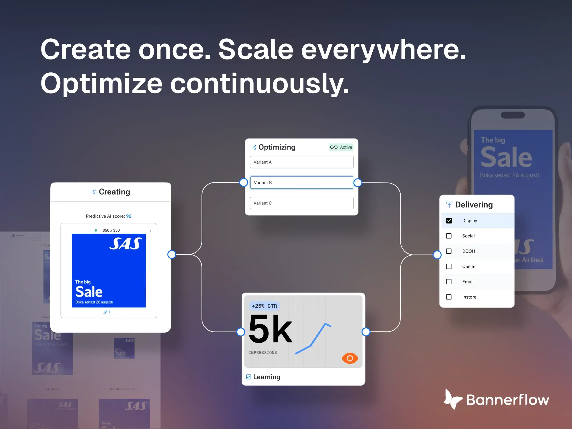 Bannerflowは、AIを活用したクリエイティブ自動化プラットフォームです。広告ワークフローを統合し、より迅速な広告配信と、あらゆるチャネルでの測定可能なパフォーマンスの向上を実現します。クリエイティブ制作、パーソナライズ、最適化を自動化し、ブランドの一貫性を保ちながら、大規模なキャンペーン展開を支援します。
