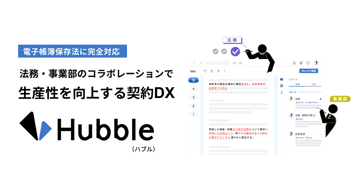 日本語対応Hubbleは、契約書の作成から管理までを効率化する契約書管理クラウドです。バージョン管理、差分チェックなどの機能に加え、コミュニケーションツールや電子締結サービスとの連携により、契約業務を一本化しサポートします。